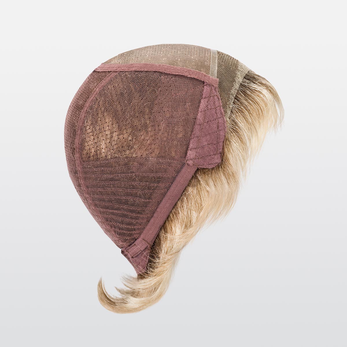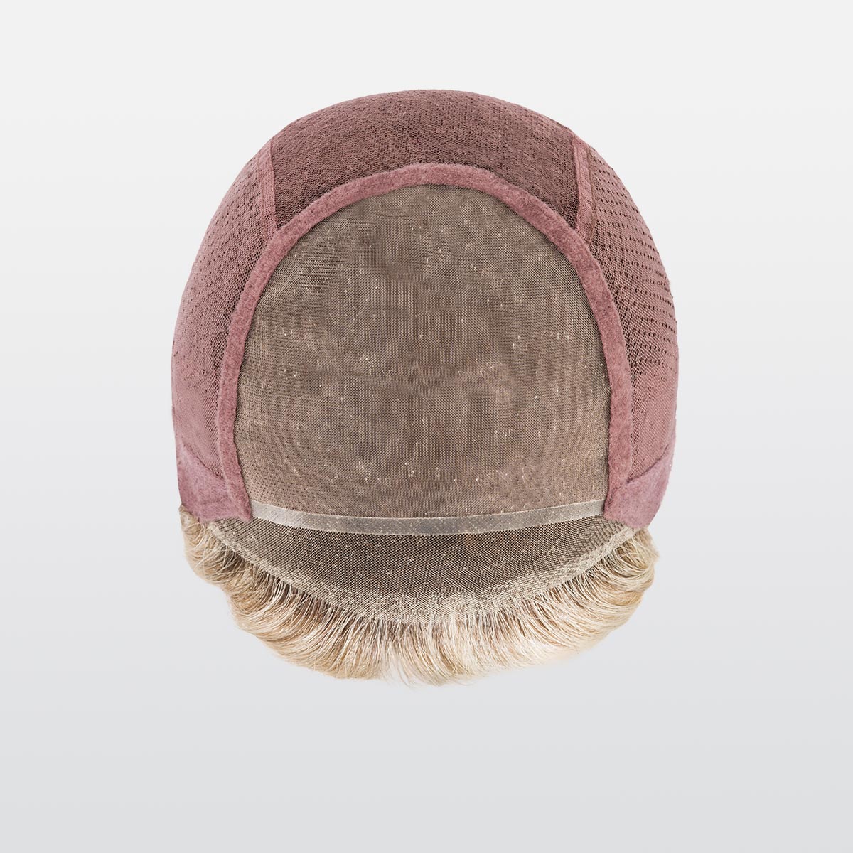 This wig model features a monofilament at the cap. The hair is meticulously hand-attached to a fabric that mimics the appearance of skin, providing a perfectly natural look at this area. The rest of the structure is accentuated, with the hair sewn onto thin cotton strips. The wefts fit the shape of the head well and allow for excellent ventilation.