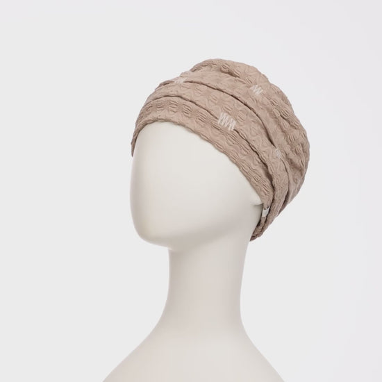 A true invitation to travel , this Scandinavian bohemian style hat seduces with its soft, light materials and elegant pleated effect . Easy to wear, it combines absolute comfort and discreet refinement.