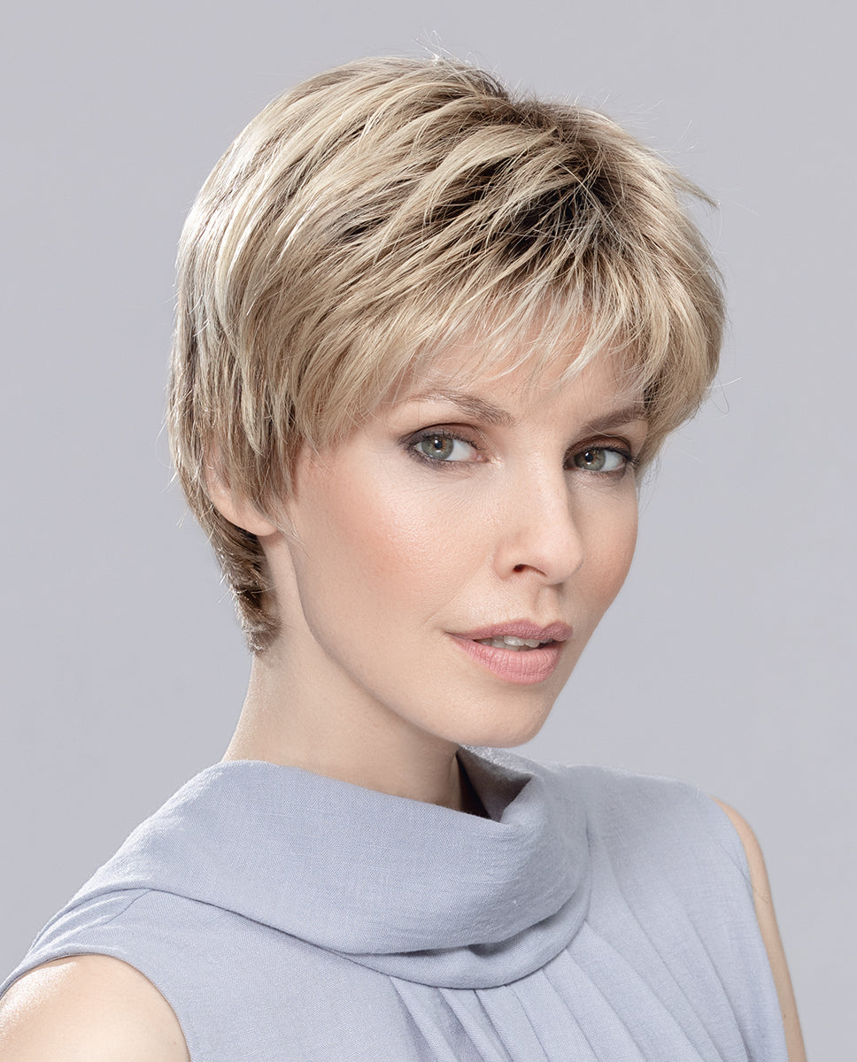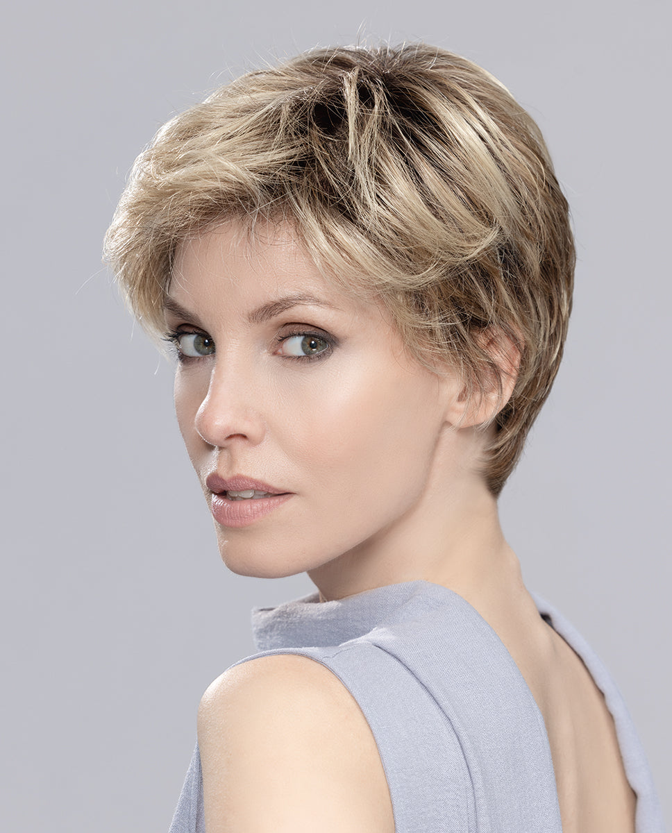 Meet Estate Mono: a sleek synthetic pixie wig with a luxurious cap design . Featuring an extended cinema tulle and a full monofilament top for an ultra-natural look . Its innovative design incorporates silicone patches for added security . Available in a variety of colors, including the most popular shades of gray.