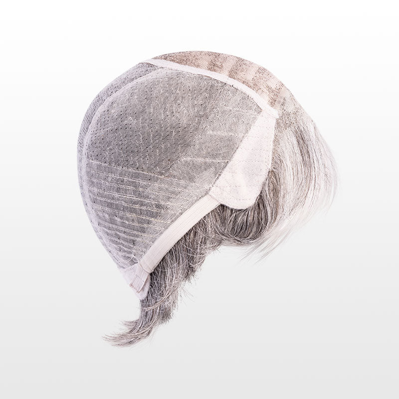 This wig model features a monofilament at the cap. The hair is meticulously hand-attached to a fabric that mimics the appearance of skin, providing a perfectly natural look at this area. The rest of the structure is accentuated, with the hair sewn onto thin cotton strips. The wefts fit the shape of the head well and allow for excellent ventilation.