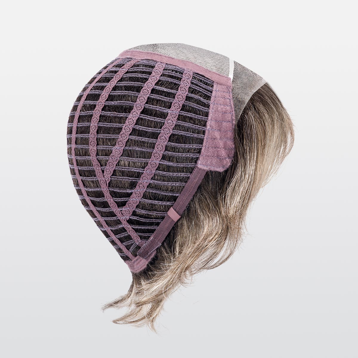 The monofilament covers the upper part of the head. It is an invisible micro-skin on the scalp, where each hair is carefully knotted one by one. The rest of the frame is mainly made up of braids, on which the hair is sewn by machine on very thin stretch cotton ribbons. These braids fit perfectly to the shape of the head and are arranged in an airy way. On the top, the hair hand-tied on the monofilament offers a very natural look.