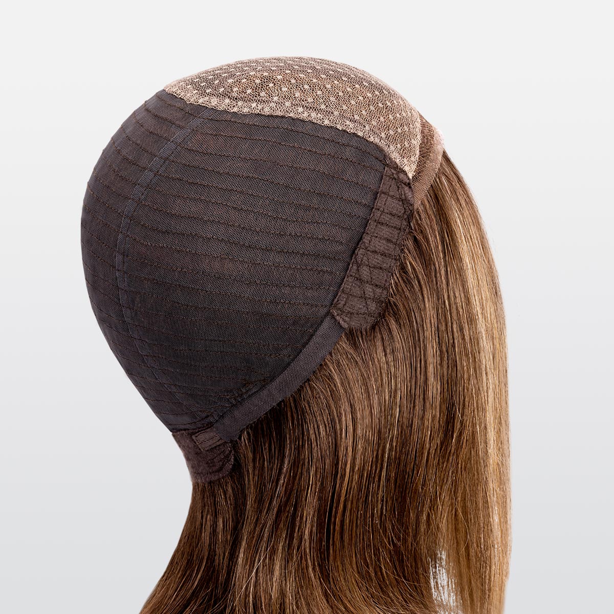 Ultra natural at the parting or roundabout, this type of frame allows these areas to appear organically thanks to the transparency of the micro-skin. Each hair is carefully tied one by one, and the shape of this part, whether round or parted, varies according to the cuts, thus making the hair particularly realistic. The hair implanted on the monofilament gives the impression that it takes root directly on the scalp. The rest of the frame is mainly composed of braids, where the hair is sewn by machine on very fine stretch cotton ribbons. These braids adapt perfectly to the shape of the head and are arranged in an airy manner.