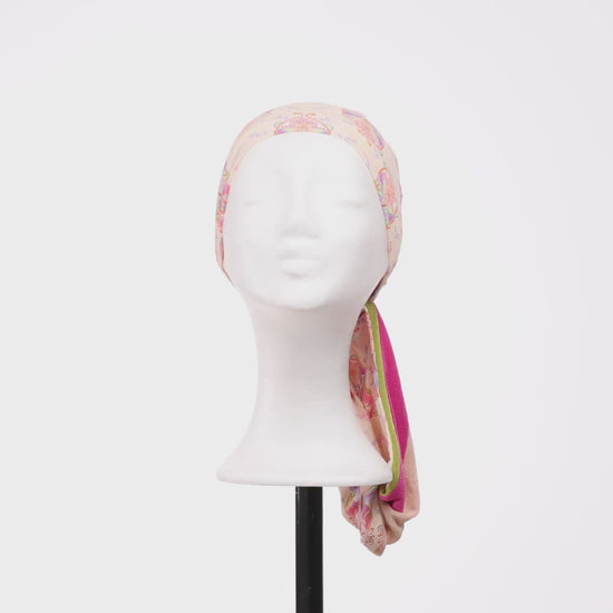The HocShakti is a stylish turban with a semi-attached headband for different styles and added volume. The headband can be tied or transformed into a decorative bun, adding a modern touch. Made from Caretech® bamboo viscose , it is soft, breathable and temperature regulating for optimal comfort. The Crocus Kaleidos pattern combines shades of pink, purple and green on a cream background, with a reversible headband featuring both vibrant colours and the Crocus print.