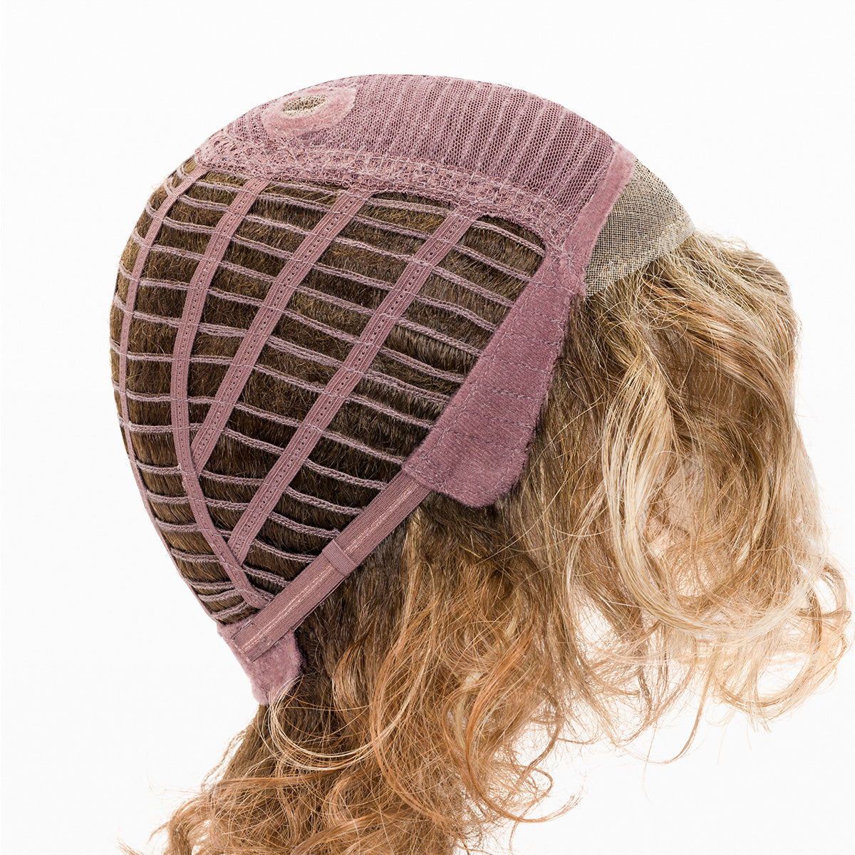 Ultra naturel au niveau de la raie ou du rond-point, ce type de monture permet à ces zones d'apparaître de manière organique grâce à la transparence de la micro-peau. Chaque cheveu est soigneusement noué un par un, et la forme de cette partie qu'elle soit ronde ou en raie varie selon les coupes, rendant ainsi la chevelure particulièrement réaliste. Les cheveux implantés sur le monofilament donnent l’impression qu'ils prennent racine directement sur le cuir chevelu. Le reste de la monture est principalement composé de tresses, où les cheveux sont cousus à la machine sur des rubans en coton extensible très fins. Ces tresses s'adaptent parfaitement à la forme de la tête et sont disposées de manière aérée.