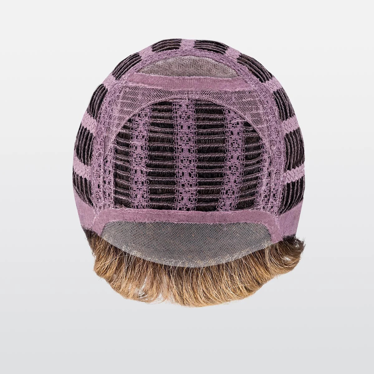 Ultra naturel au niveau de la raie ou du rond-point, ce type de monture permet à ces zones d'apparaître de manière organique grâce à la transparence de la micro-peau. Chaque cheveu est soigneusement noué un par un, et la forme de cette partie qu'elle soit ronde ou en raie varie selon les coupes, rendant ainsi la chevelure particulièrement réaliste. Les cheveux implantés sur le monofilament donnent l’impression qu'ils prennent racine directement sur le cuir chevelu. Le reste de la monture est principalement composé de tresses, où les cheveux sont cousus à la machine sur des rubans en coton extensible très fins. Ces tresses s'adaptent parfaitement à la forme de la tête et sont disposées de manière aérée.